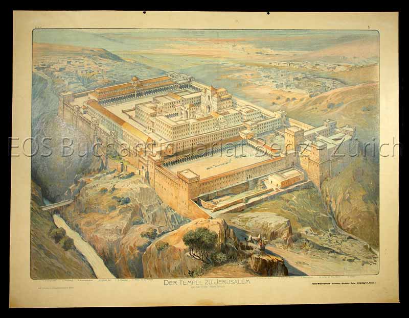 Anonym: Der Tempel zu Jerusalem zur Zeit Christi. (Nach Schick). Leipzig, Otto Wachsmuth, um 1930. Farbige Lithographie auf starkem Karton 67 x 88 cm.