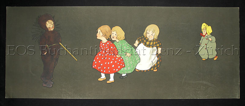Als Wandbild oder Fries für Kinderzimmer und Schulen gedacht. Ursprünglich wurden diese Wandfriese mit der Darstellung von kindlichen Motiven und Märchen von Gertrud Caspari gemacht und über den Verlag Voigtländer vertrieben. Da dieses Geschäft erfolgreich schien, kopierte der Berliner Plakatverlag Hollerbaum & Schmidt dieses Idee. – Sehr dekoratives Blatt.