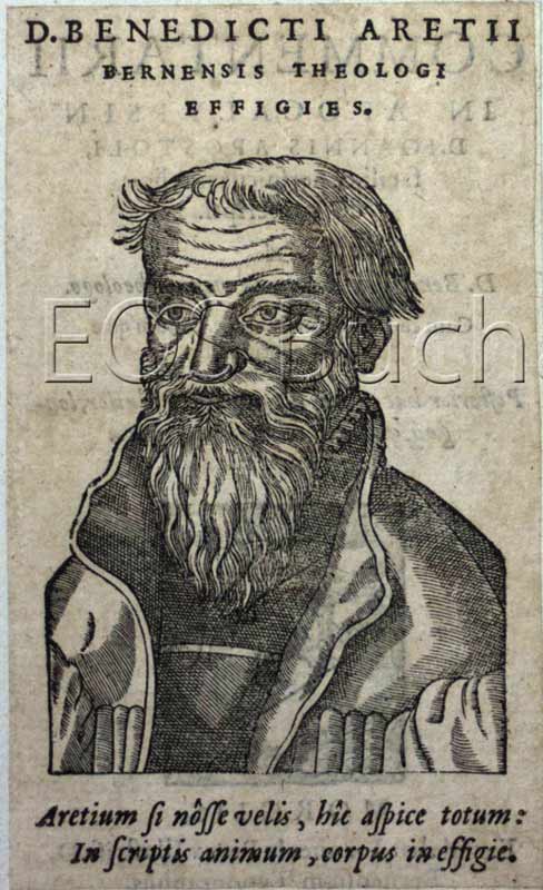 Benedikt Aretius, geboren als Benedikt Marti ging nach seinem Theologiestudium nach Strassburg und Marburg, wo er ab 1548 Professor für Logik und Dialektik wurde. 1549 Rückkehr nach Bern und ab 1553 Professor für Griechisch und Latein. “Als Theologe ist der stark bibl. argumentierende und von Zwinglis und Bullingers Bundestheologie beeinflusste A., der seinen urspr. Namen gräzisiert hatte, u.a. als Verfasser bibl. Kommentare und der “Theologiae Problemata” hervorgetreten. Bedeutender Botaniker mit internat. Ausstrahlung (Pflanzengattung Aretia), Verfasser einer Darstellung der Alpenflora von Stockhorn und Niesen …” (HLS). – Bis zum Bildrand beschnitten.
