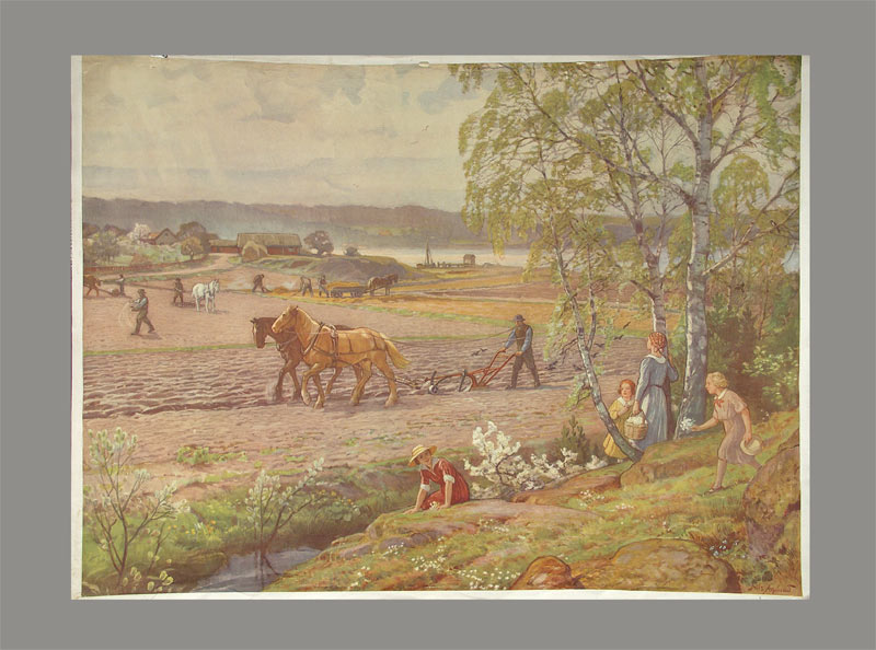Asplund, Nils (1874 – 1958): Feldumpflugung. o.J. (um 1950). Farbiger Offsetdruck. Bildformat: 101.5 x 78 cm.