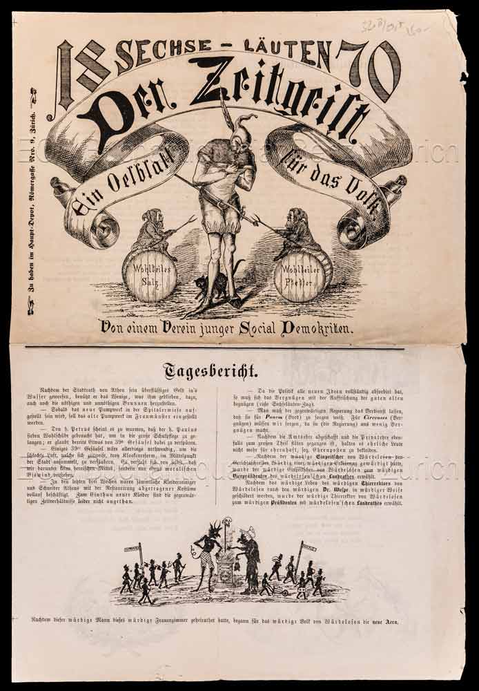 Sechseläuten. – Der Zeitgeist. Sechse-Läuten 1870. Ein Oelblatt für das Volk. Von einem Verein junger Social Demokritten. Zürich, 1870. 4 gef. S. mit Illustr. Format: 46 x 31 cm.