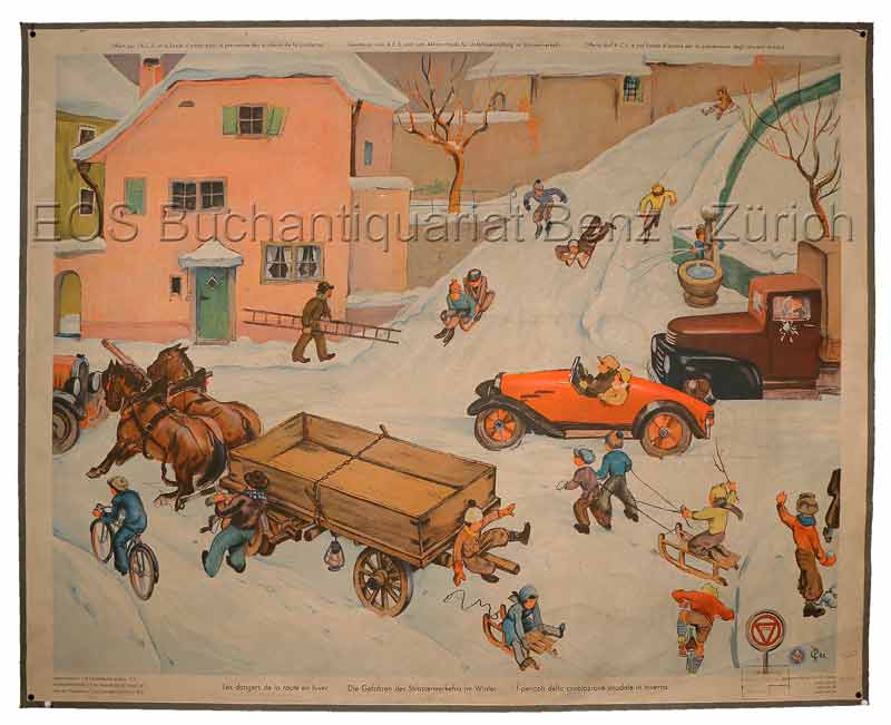 Die Gefahren des Strassenverkehrs im Winter. Genf, Atar S.A., 1952. Farbiger Offsetdruck auf Leinen aufgezogen. Bildformat: 74 x 94 cm.