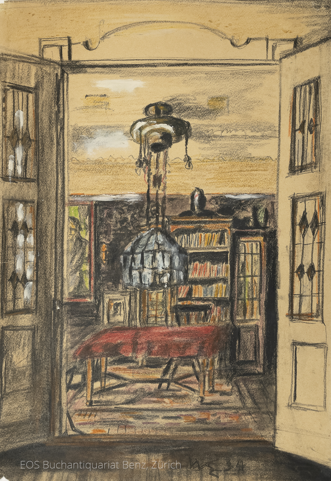 Eckertz, Waldemar (1878–1947): Zimmer in der Taunusstr. 14, Berlin 42. 1934. Farbige Ölkreide auf festem Papier, unten links monogrammiert und datiert. 54 x 38 cm.