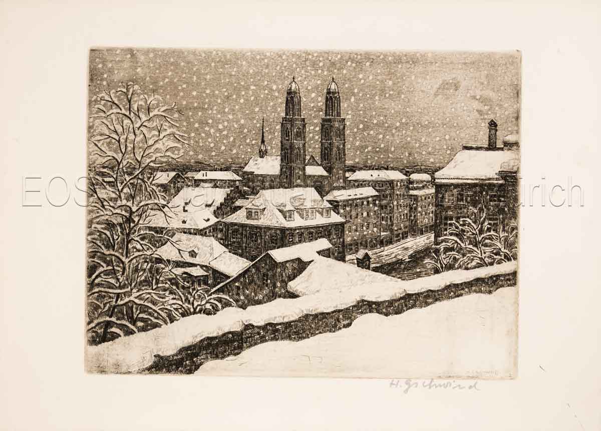 Gschwind, Hans. (1907 – 1992) Verschneites Grossmünster vom Lindenhof.  Radierung. Mit Bleistift signiert. Bildgrösse: 25 x 19 cm. Blattgröse: 36 x 25 cm.