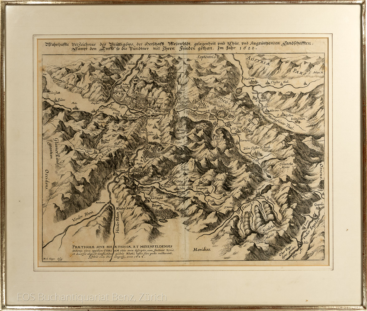 Gyger, H.C.Gyger.- Wahrhaffte Verzeichnüs des Prättigöws, der Herrschafft Meyenfeldt, gelegenheit umb Chur, und Angräntzenden Landschafften Sampt den Treffe so die Pündtner mit Ihren Feinden gethan, Im Jahr 1622.  (1635) Kuperstich von Matthäus Merian. Blattgrösse: 28,5 x 37 cm. Bildgrösse: 40 x 49 cm.
