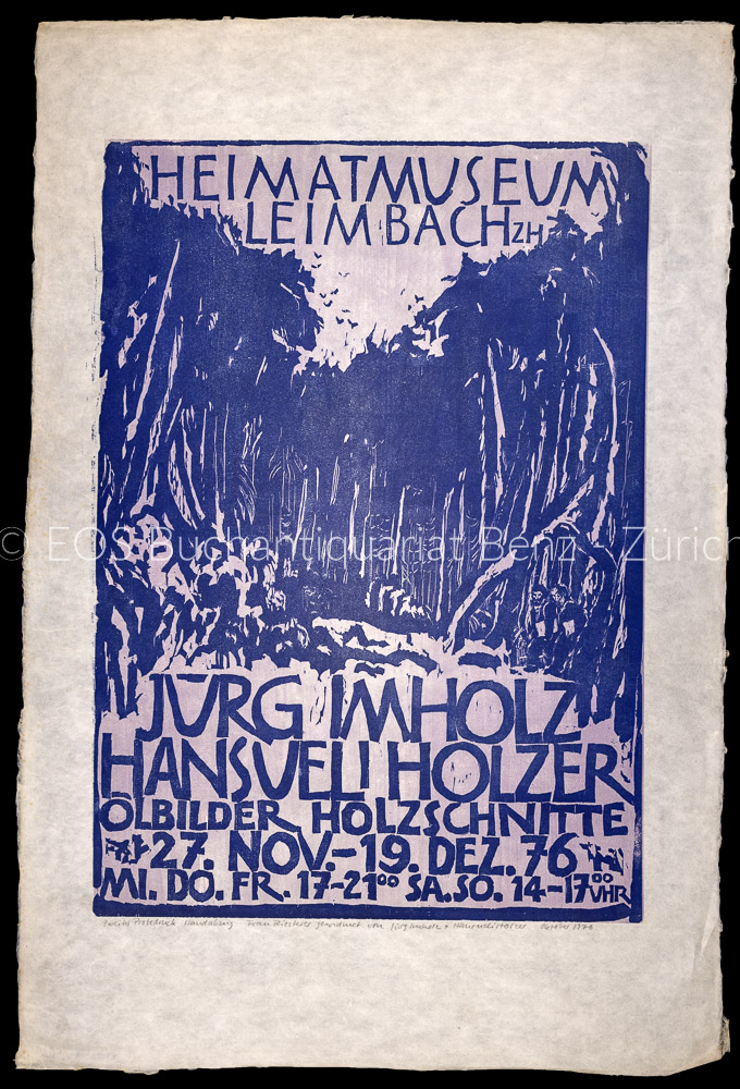 Ausstellungsplakat: Jürg Imholz und Hansueli Holzer – Ölbilde Holzschnitte – 27. Nov.–19. Dez. 76. – Mit Widmung in Bleistift: Zweiter Probedruck – Handabzug. Frau Riesterer gewidmet von Jürg Imholz und Hansueli Holzer – Oktober 1976.