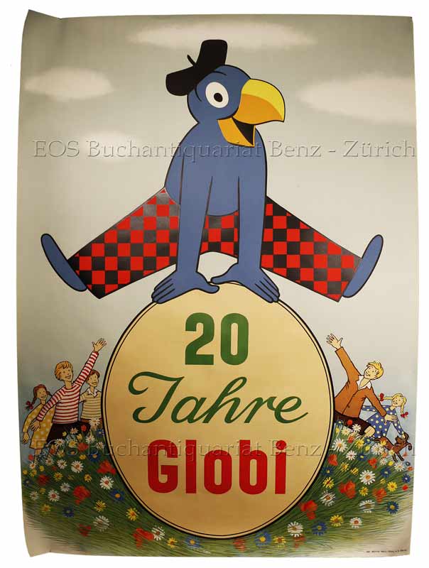 Werbe-Plakat zum 20 jährigem Jubliäum der Kinderfigur Globi. – Sehr gut erhaltenes Exemplar.