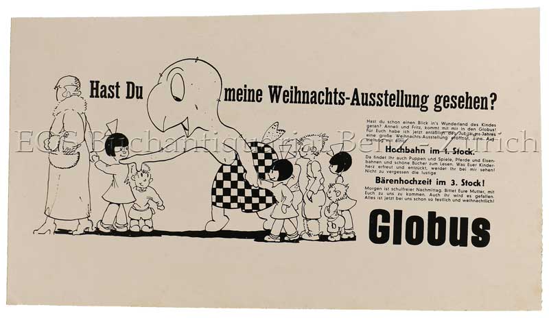 Globi. – Lips, Robert (1912-1975): Hast Du meine Weihnachts-Ausstellung gesehen? Zürich, Globus, um 1932. Blattgrösse: 19 x 33.5 cm.