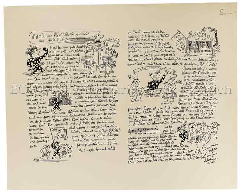Globi. – Lips, Robert (1912-1975): Maxli der Fiertklässler gründet einen Globi Club! Zürich, Globus, um 1932. Blattgrösse: 30 x 37 cm.