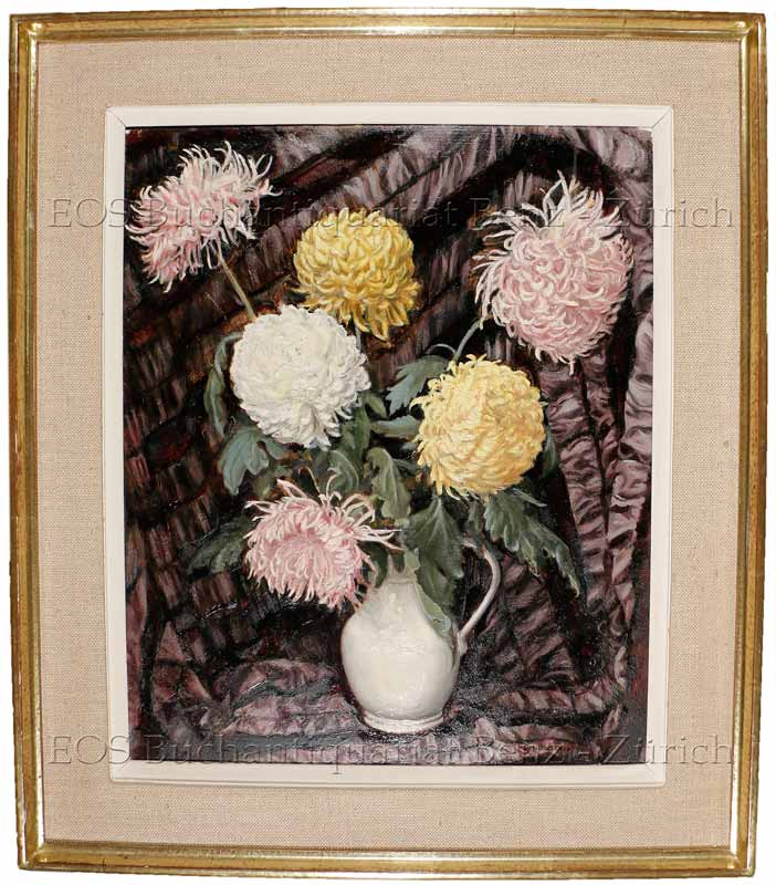 Magnhild, Baecki: Chrysanthemen in Vase. O.O., 1954. Oelgemälde. Bildgrösse: 50 x 41 cm. In Rahmen.