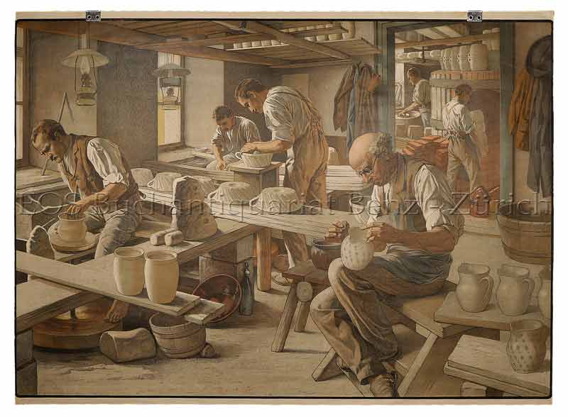 Meinhold: Töpfer – Hafner. Dresden, C. C. Meinhold & Söhne o.J. (um 1930). Farbige Lithographie auf festem Papier. Bildformat: 62 x 87 cm.