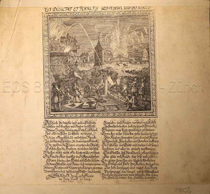 Neujahrsblatt der Costaffler und Feuerwerker (im Zeug-Hauss). – Mörserschiessen auf der Bauschanze. Zürich, 1690. Kupferstich von Johann Meyer. 29 x 31 cm.
