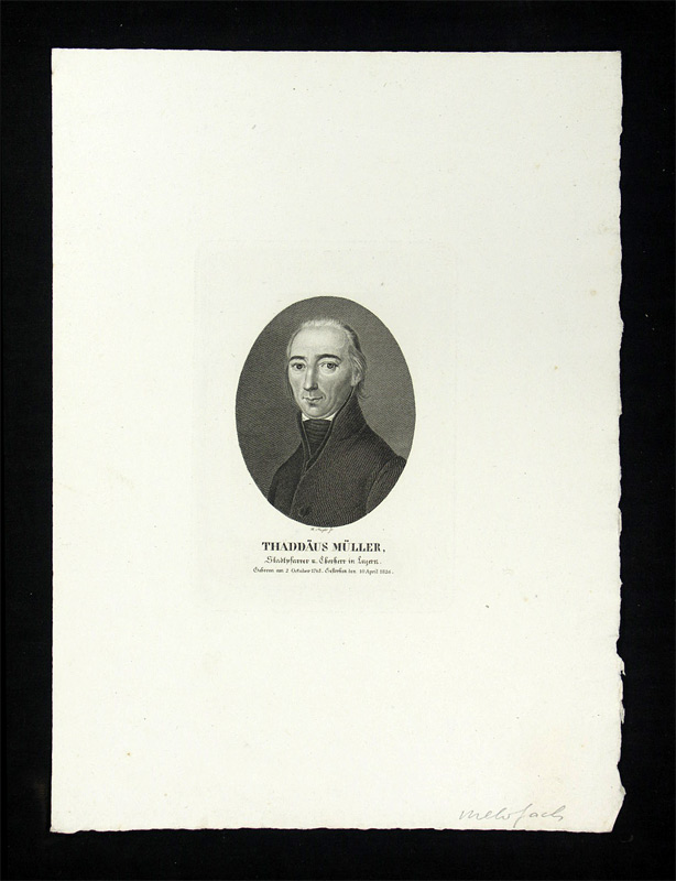 Müller, Thaddäus (1763-1826): Stadtpfarrer und Chorherr in Luzern. o.J. (um 1830). Stahlstich von H. Meyer (ovales Brustbild). Bildgrösse: 9,5 x 7,5 cm. Blattgrösse: 31,8 x 23 cm.