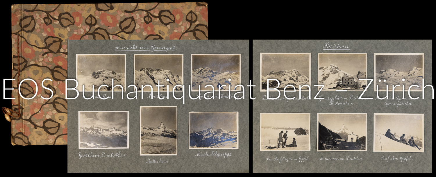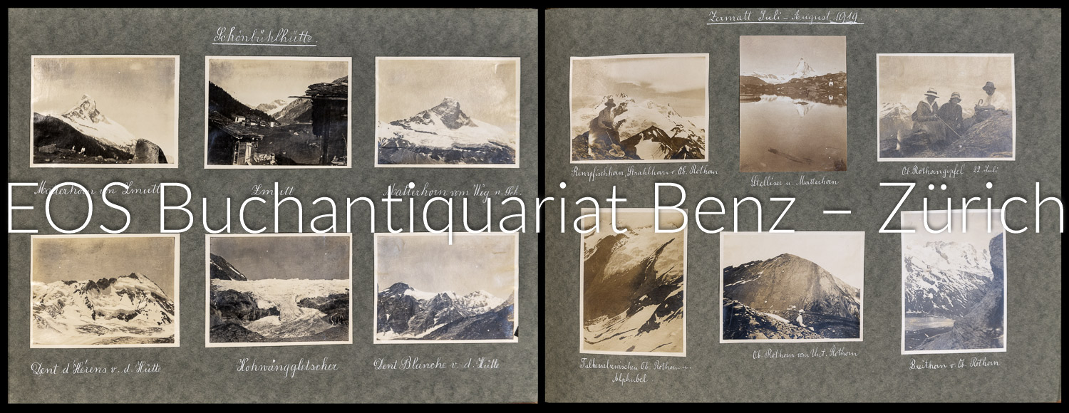 Die mit weisser Tusche untertitelten Aufnahmen zeigen u.a. Monte Rosa, Breithorn, Matterhorn, Weisshorn, Gornergrat, Gornergletscher, Triftbach, Zinalrothorn, Hohwänggletscher, Zmutt, Mettelhorngrat u. Zermatt. – Das Zwiebelpapier zum Schutz der Photographien gebräunt u. stellenweise knitterfaltig od. mit Knickspuren.