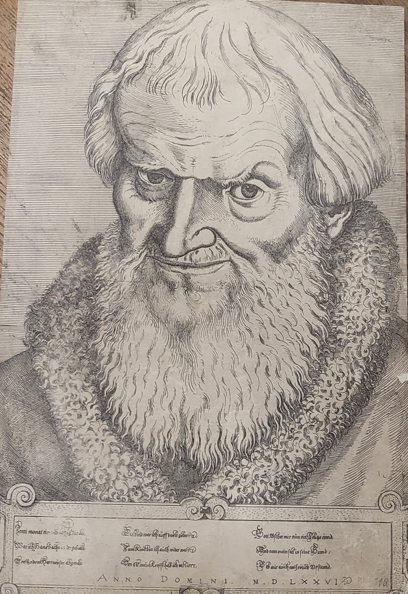 Sachs, Hans (1494-1576): Dt. Lyriker u. Dramatiker. O.J. (um 1580). Kupferstich (Brustbild). Bild- u. Blattgrösse: 28,5 x 19,5 cm.