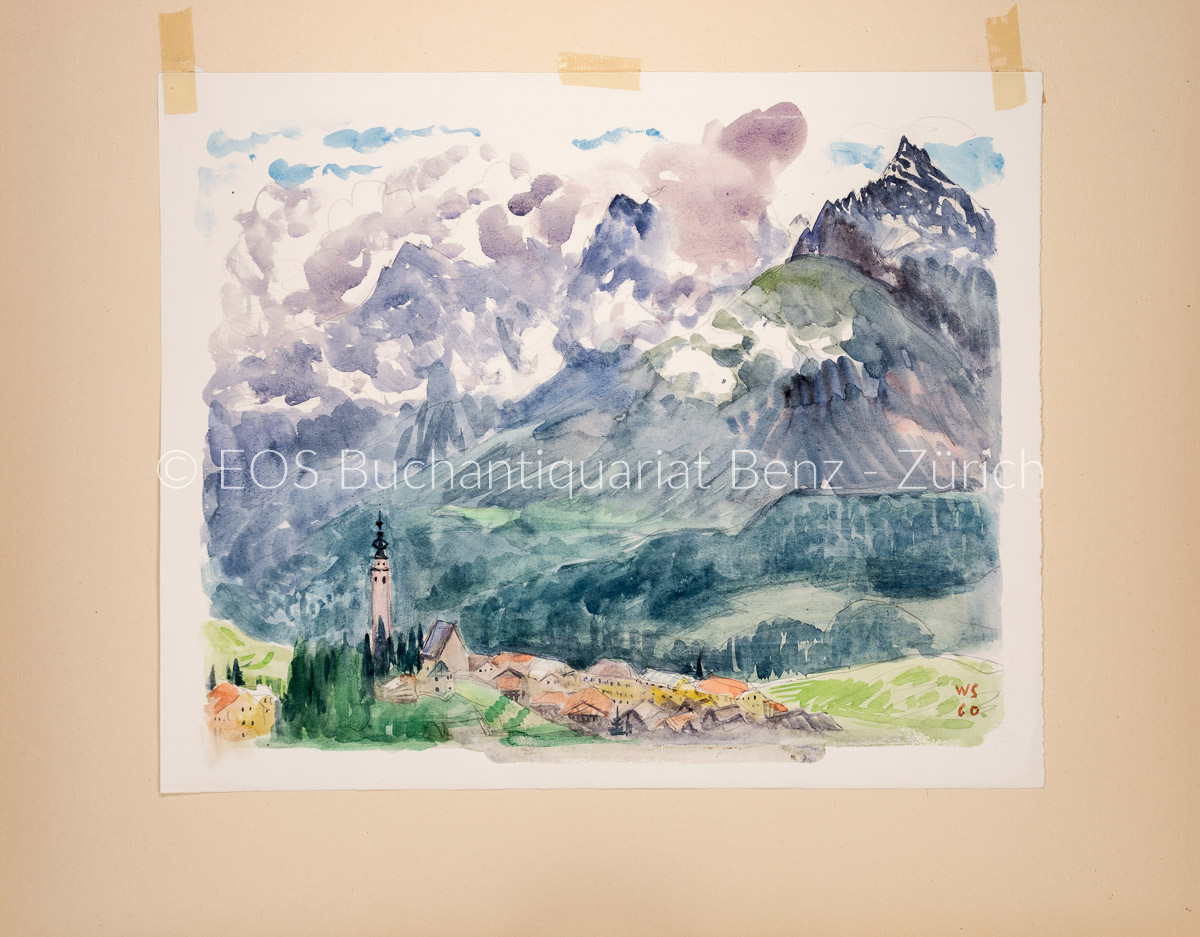 Sautter, Walter (1911–1991); Ftan mit Blick ins Tal. 1962. Aquarell auf festem Papier. Bildausschnitte: 32,5 x 40 cm. Blattgrösse: 35 x 43 cm.