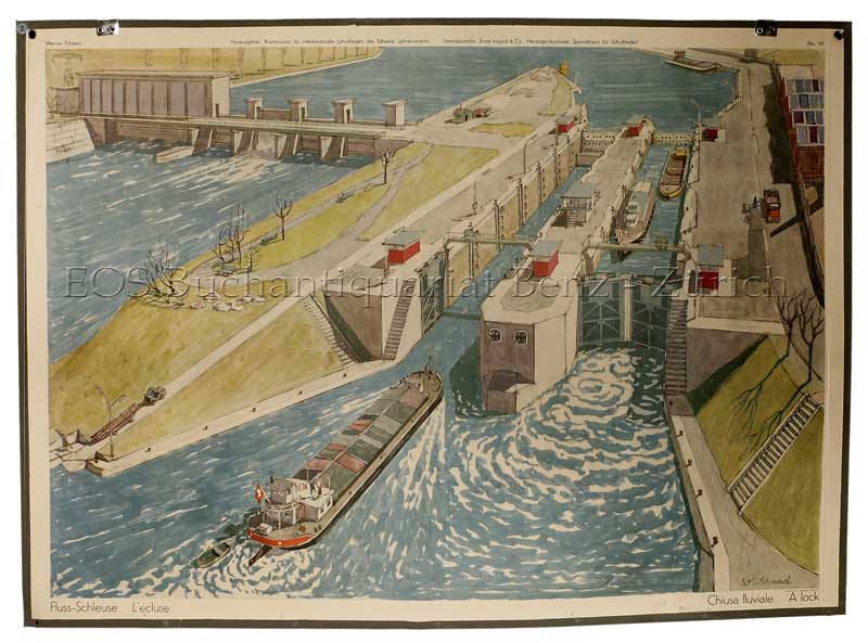Schaad, Werner (1905 – 1979): Fluss-Schleuse – L’écluse – Chiusa fluviale – A lock.  Herzogebuchsee, Ernst Ingold, 1957. Farbiger Offsetdruck auf Papier auf Leinen aufgezogen. Bildformat: 66 x 91 cm.