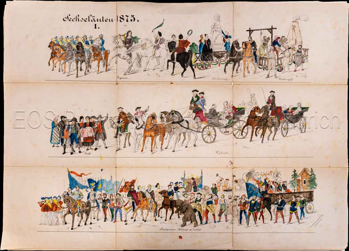Sechseläuten. – Sechseläuten 1875. Bilder aus Schillers und Göthes Dichtungen. Zürich, R. Fretz u. C. Knüsli. 1875. 3 lithogr. kol. gef. Blatt + Programm (16 S.). Blattgrösse: 48 x 59 cm.