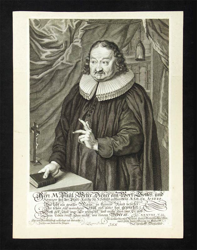 Weber, Paul Dt. Theologe. O.J. (um 1700). Kupferstich von Joachim von Sandrart (d.J.) nach J.L. Kramer. Bildgrösse: 25.9 x 21 cm. Blattgrösse: 33.8 x 25.5. cm.