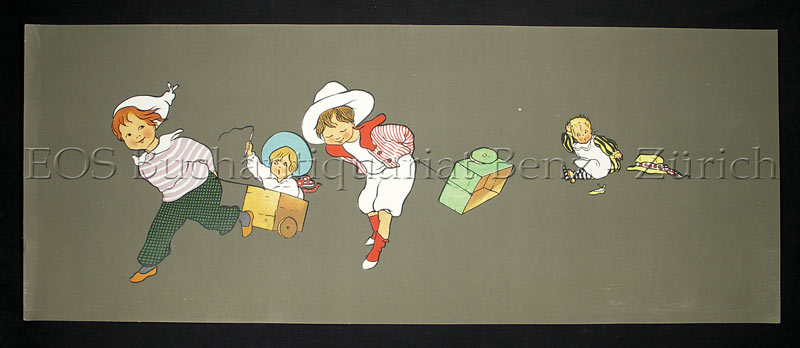 Als Wandbild oder Fries für Kinderzimmer und Schulen gedacht. Ursprünglich wurden diese Wandfriese mit der Darstellung von kindlichen Motiven und Märchen von Gertrud Caspari gemacht und über den Verlag Voigtländer vertrieben. Da dieses Geschäft erfolgreich schien, kopierte der Berliner Plakatverlag Hollerbaum & Schmidt dieses Idee. – Sehr dekoratives Blatt.