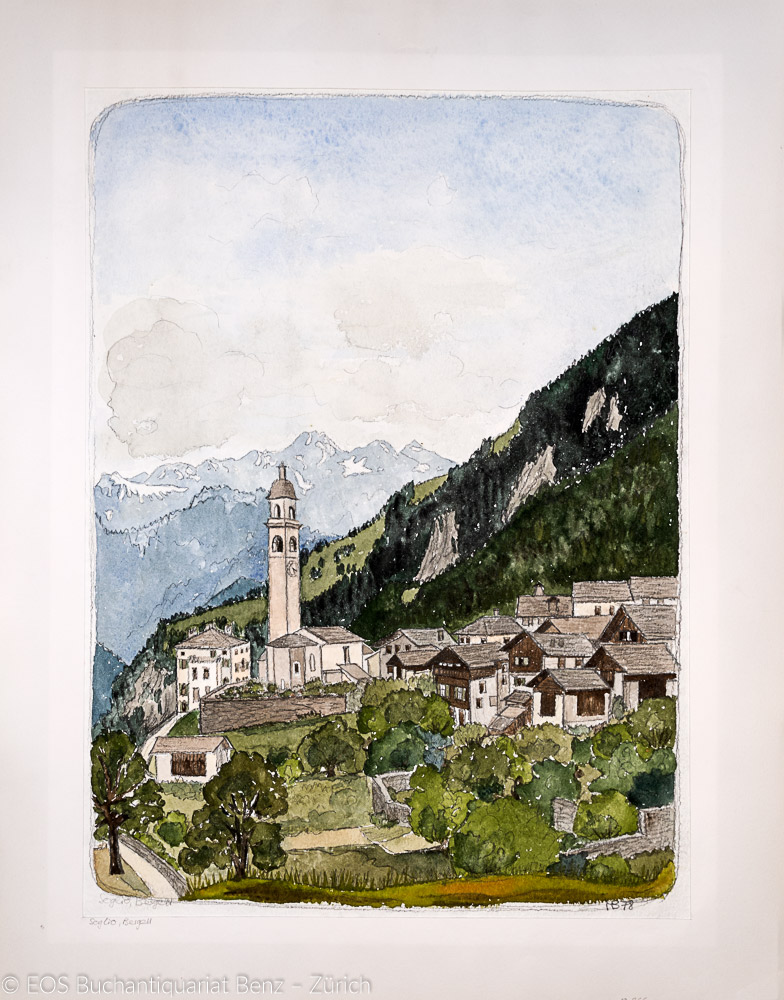 Anonym: Soglio, Bergell 1878. Aquarell. Bildausschnitt: 52 x 37 cm.