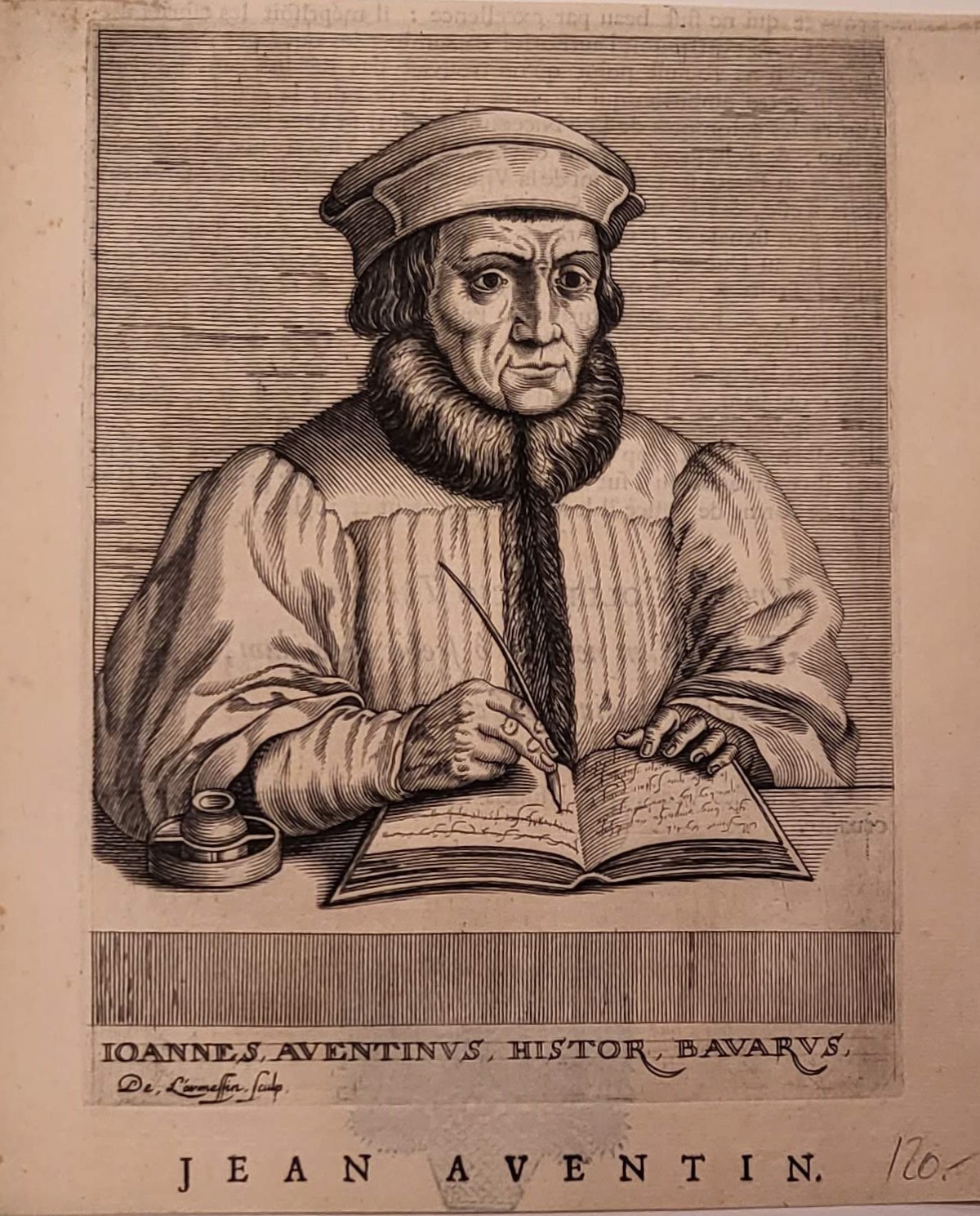 Aventinus, Johannes (eigentlich J. Turmair) (1477-1534). Histor. Bavarus – Jean Aventin. ca. 1680. Kupferstich von Nicolas II de Larmessin (1632–1694). Bildgrösse: 18 x 13,5 cm. Blattgrösse: 20,5 x 17,5 cm.