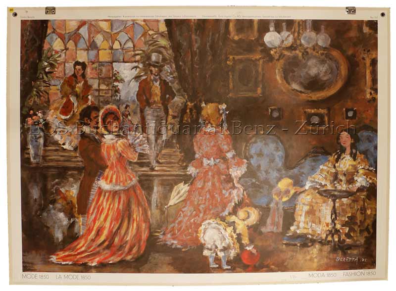 Beretta, Emilio (1907-1974): Mode 1850 – La mode – Moda – Fashion. Herzogenbuchsee, Ernst Ingold, 1973. Farbiger Offsetdruck auf Papier auf Leinen aufgezogen. Bildgrösse: 65 x 90 cm.