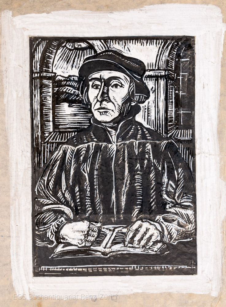 Zwingli. –    Bosshart, Ernst (1879–1951): Portrait von Ulrich Zwingli  Tuschzeichnung und weiss erhöht. Bildausschnitt: 27 x 20.