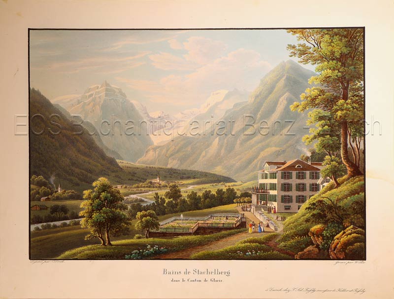 Corrodi, Salomon (1810-1892): Bains de Stachelberg dans le Canton de Glaris. Zürich, F. Sal Füssly successeur de Keller et Füssly, um 1835. Aquatinta von Lukas Weber (1811-1860). Bildgrösse: 17,2 x 25,2 cm. Blattgrösse: 22,4 x 29,6 cm.