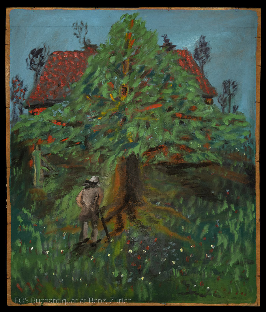 Eckertz, Waldemar (1878–1947): Baumlandschaft mit Mann und Gestalt im Vordergrund. Bauernhaus im Hintergrund. (1934) Ölgemälde auf Holz. 72 x 59 cm.