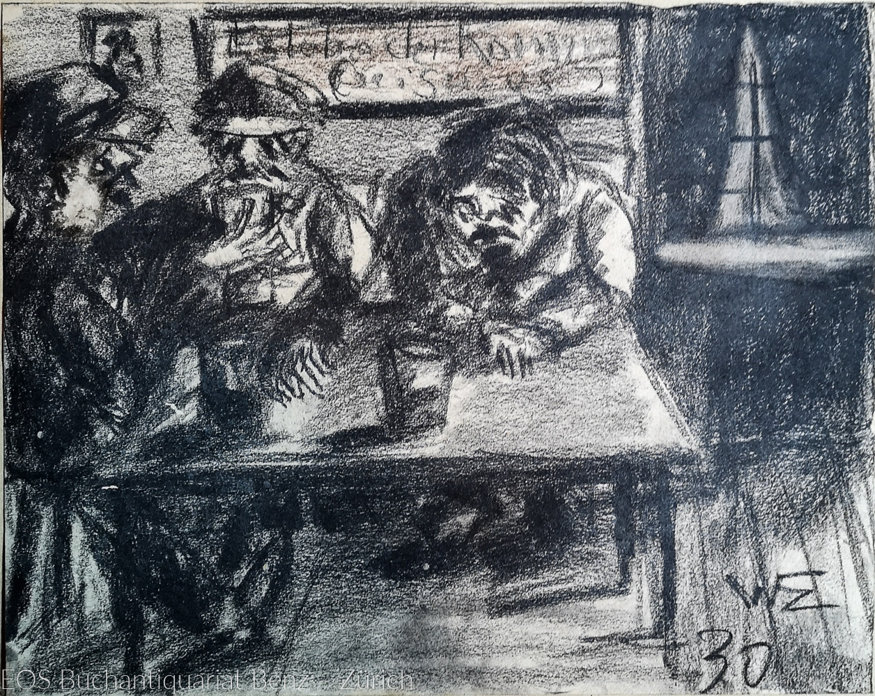 Eckertz, Waldemar (1878–1947): (Drei Männer in der Kneipe). 1930. Ölkreide schwarz auf festem Blatt montiert, monogrammiert und datiert. 25 x 32 cm.