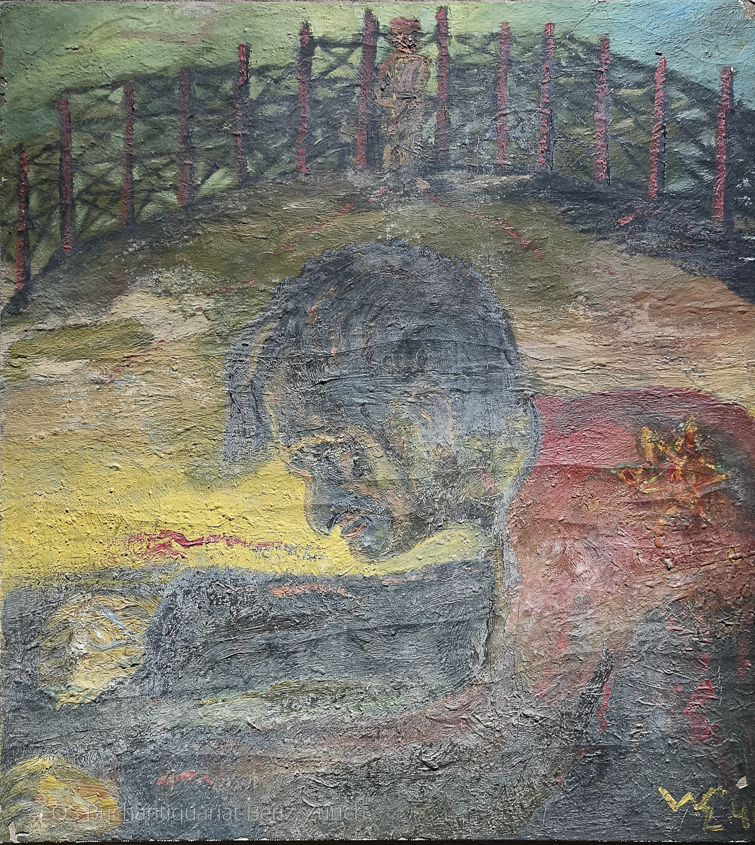 Eckertz, Waldemar (1878–1947): (Gebückter Mann, Zaun im Hintergrund) 1946. Oel auf Holz, unten rechts monogrammiert und datiert. 68 x 59 cm.