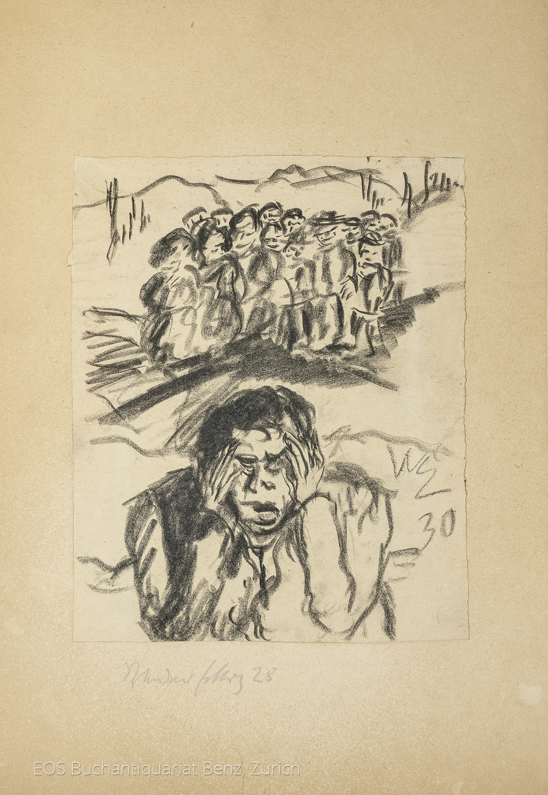 Eckertz, Waldemar (1878–1947): Gestalt im Vordergrund, Menschengruppe im Hintergrund. 1930 Kohlezeichnung. Unten rechts monogrammiert und datiert. Zusätzlich unten links auf dem Passe-Partout signiert und datiert (28). 25 x 20.5 cm.