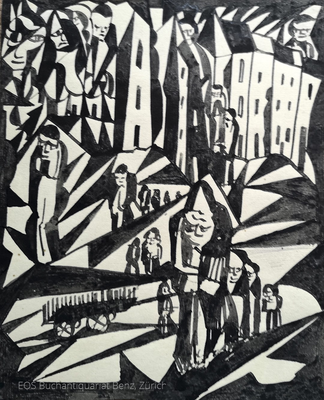 Eckertz, Waldemar (1878–1947): (Häuserzeilen, dazwischen Personen und ein Wagen). ca. 1926 Tusche auf festem Papier, auf der Rückseite monogrammiert. 19 x 15 cm.