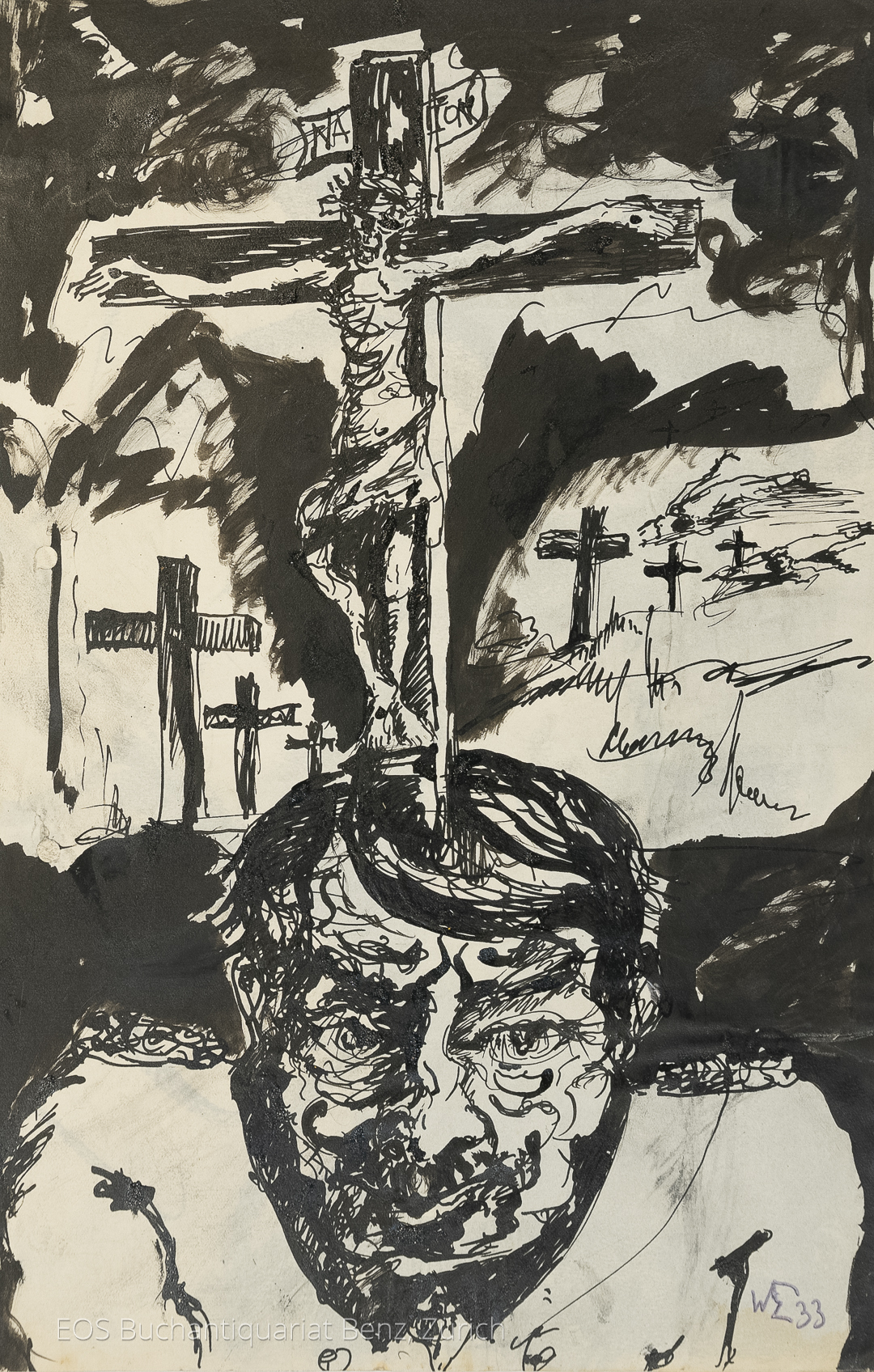 Eckertz, Waldemar (1878–1947): Kreuzigung und Männerkopf. Mit Kreuzen im Hintergrund. 1933. Tusche auf festem Papier, unten rechts monogrammiert und datiert. 32 x 21 cm.