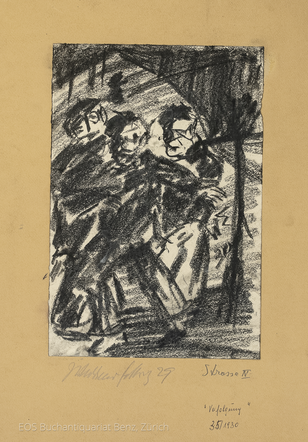 Eckertz, Waldemar (1878–1947): Strasse IV. – Verfolgung. 1930. Kohlezeichnung auf festem Papier. Auf dem Passe-Partout singniert, datiert und beschriftet. 25 x 17 cm.
