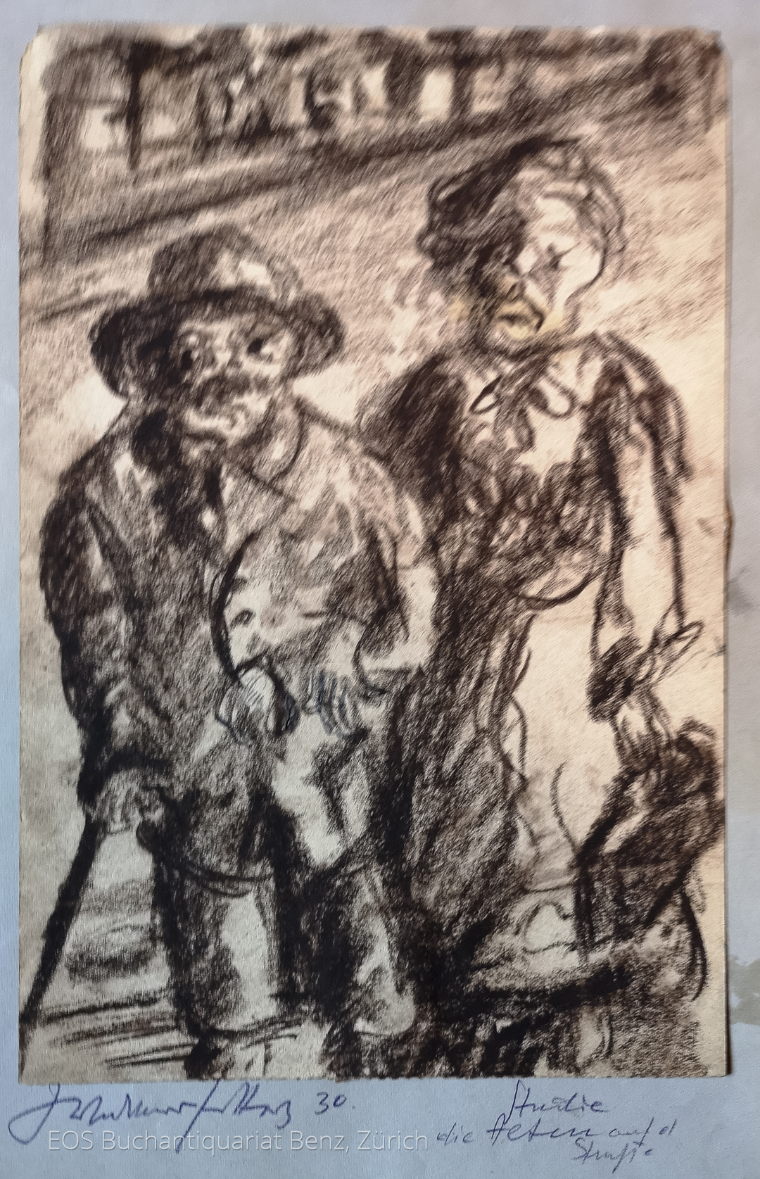 Eckertz, Waldemar (1878–1947): Studie – Die Alten auf der Strasse. 1930 Braune Kreidezeichnung. Unten auf dem Passe-Partout signiert, datiert und beschriftet. 25 x 16 cm.