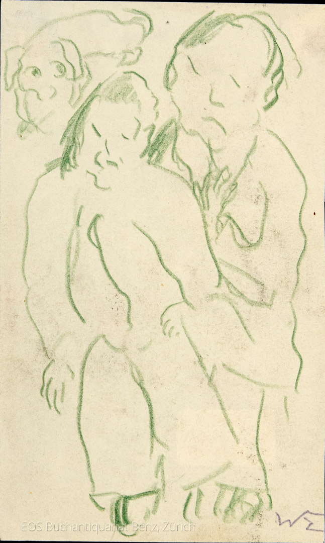 Eckertz, Waldemar (1878–1947): Zwei Menschen und ein Hund.  (1927), Grüner Farbstift auf Papier, unten rechts monogrammiert. 19 x 11 cm.