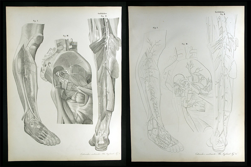 Anatomische Darstellung der unteren Extremitäten mit Blutgefässen. Tafel 24 u. 25 aus „H. Oesterreicher’s anatomische Steinstiche oder bildliche Darstellung des menschlichen Körpers“. – Leicht gebräunt. – Résumé: Plate 24 and 25 of „H. Oesterreicher’s anatomische Steinstiche…“. 2 lithographic engravings, each with 3 illustr. showing the leg anatomy with vessels (thereof 1 in outlines). – Slightly browned.