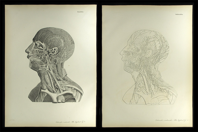 Anatomische Darstellung von Kopf und Hals mit den Lymphgefässen. Tafel 32 u. 33 aus „H. Oesterreicher’s anatomische Steinstiche oder bildliche Darstellung des menschlichen Körpers“. – Leicht gebräunt. – Résumé: Plate 32 and 33 of „H. Oesterreicher’s anatomische Steinstiche…“. 2 lithographic engravings showing head anatomy with lymphatic vessels (thereof 1 in outlines). – Slightly browned.