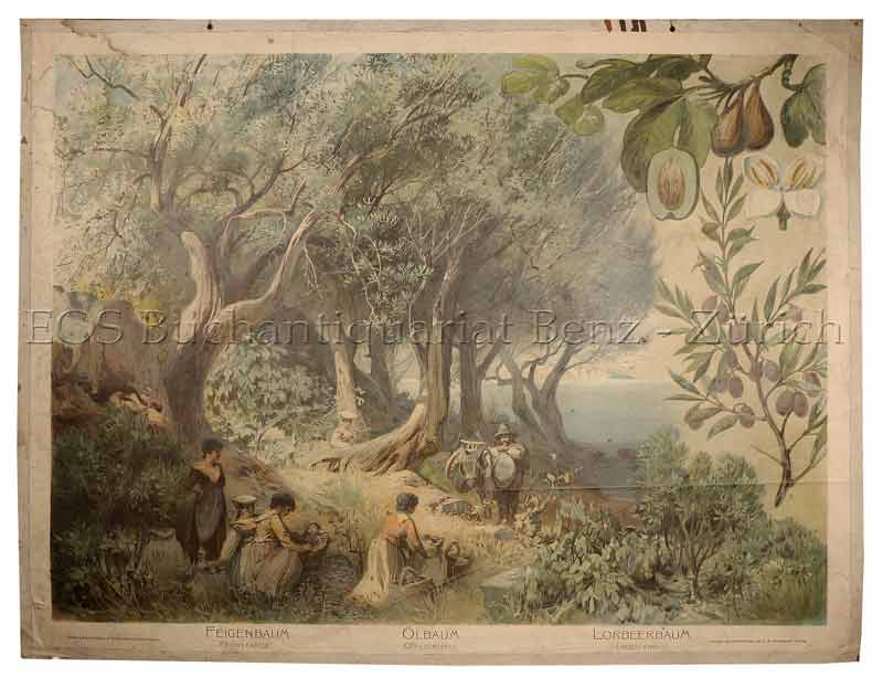 Feigenbaum, Ölbaum und Lorbeerbaum. Leipzig, F.E. Wachsmuth, um 1920: Farbige Lithographie auf festem Papier. Bildformat: 67 x 88 cm.