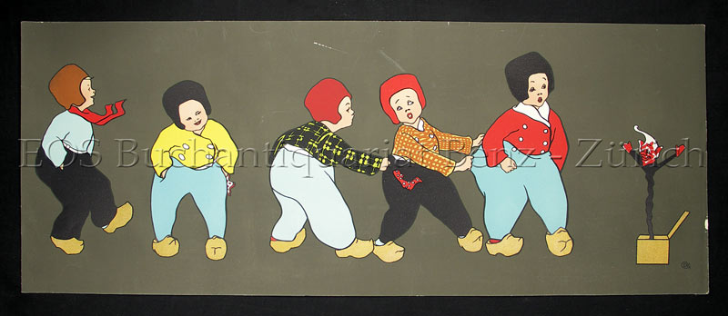 Als Wandbild oder Fries für Kinderzimmer und Schulen gedacht. Ursprünglich wurden diese Wandfriese mit der Darstellung von kindlichen Motiven und Märchen von Gertrud Caspari gemacht und über den Verlag Voigtländer vertrieben. Da dieses Geschäft erfolgreich schien, kopierte der Berliner Plakatverlag Hollerbaum & Schmidt dieses Idee und verpflichtete die unbekannte Künstlerin Marie von Geldern-Egmont als Zeichnerin, die sich bei vielen Motiven stark an die Friese von Caspari anlehnte. – Sehr dekoratives Blatt mit den Initialen vGE im Stein.