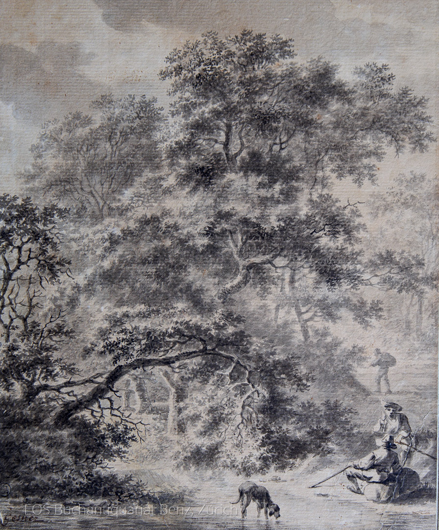Gessner, Salomon (1730–1788): Baumgruppe mit drei Hirten und Hund im Wasser. Lavierte Tuschzeichnung in Sepia. 22 x 17 cm.