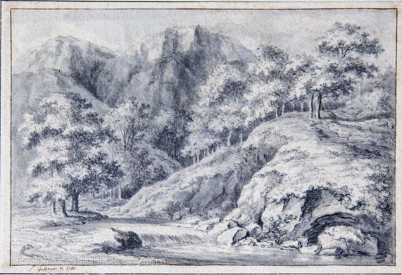 Gessner, Salomon (1730–1788): Flusslandschaft im Gebirge.  1766. Lavierte Tuschzeichnung. 16,2 x 23,5 cm.
