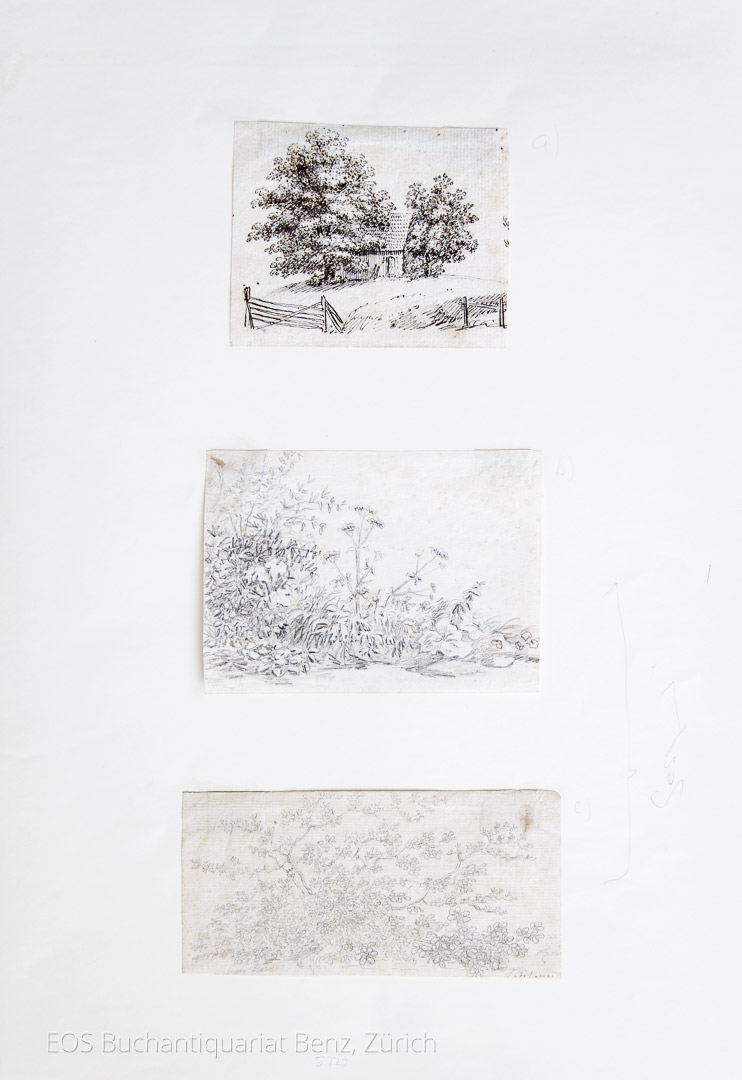 Gessner, Salomon (1730–1788): Naturstudien. 2 Bleistiftzeichnungen und 1 Tuschzeichnung. 11 x 15 cm. 17 x 8,4 cm und 10 x 12, 4 cm.