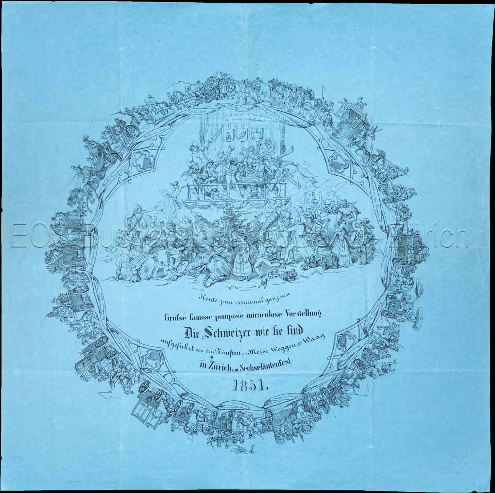 Sechseläuten. – Grosse, famose, pompose, miraculose Vorstellung: Die Schweizer wie sie sind. Zürich, Orell Füssli u. Comp., 1851. 1 gef. Blatt. Blattgrösse: 50 x 50 cm.