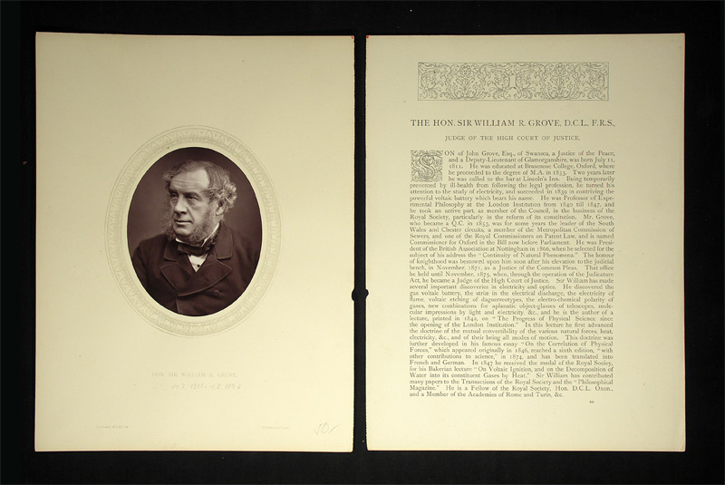 Grove, William R(obert) (1811-1896): Englischer Jurist und Naturwissenschaftler. (London), Woodbury Process o.J. (um 1890). Photographie (mont. mit ovaler Umrahmung) Bildformat: 28 x 21 cm.