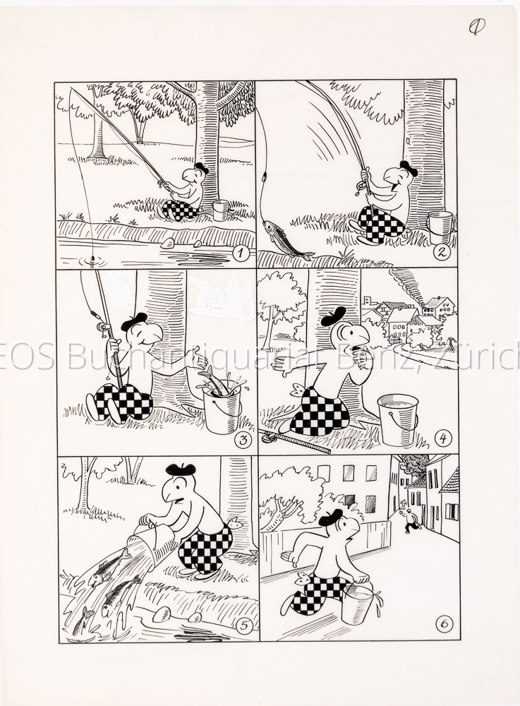 Globi. – Heinzer, Peter (1945–2015): Globi bei der Feuerwehr. 1985. Zwei Entwürfe und 48 Bleistiftzeichnungen auf Pergaminpapier. Blattformat: 42 x 29,5 cm.