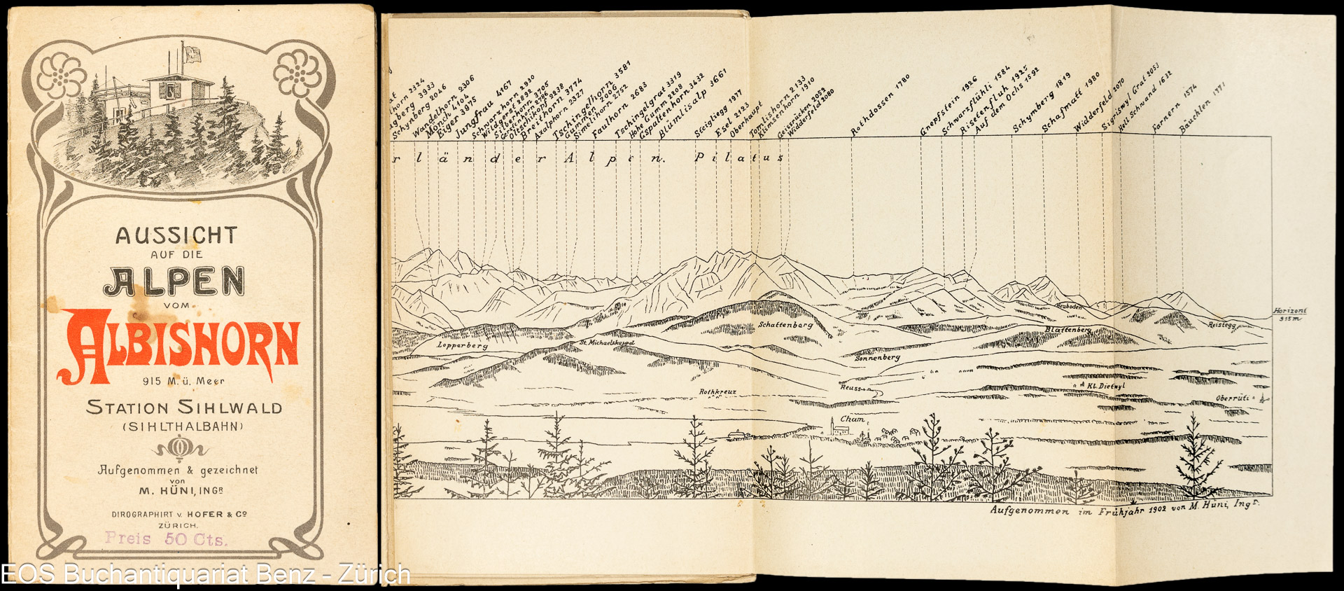 Hüni, M.: Aussicht auf die Alpen vom Albishorn 915 M. ü. Meer. Station Sihlwald (Sihltthalbahn). Aufgenommen und gezeichnet von M. Hüni. Zürich, 1902. gef. Panorama: 11 x 177 cm. Blattgrösse: 17,5 x 182 cm.