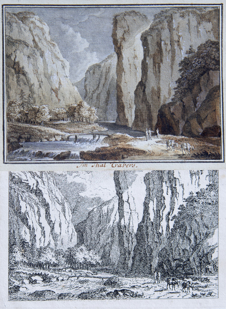 Im Thal Travers. Aquarell nach Salomon Gessner. 9,2 x 12,5 cm.